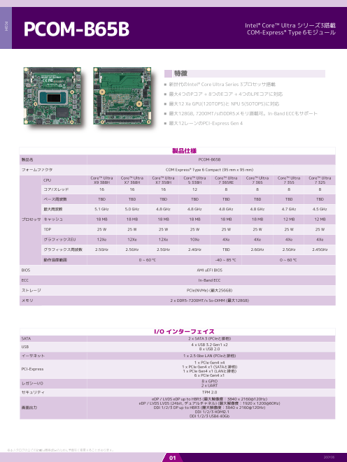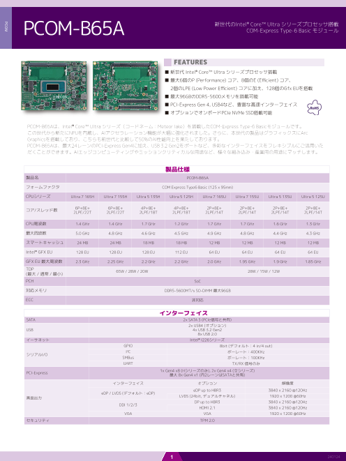 PCOM-B65Aは、Intel® Core™ Ultra シリーズ(コードネーム:Meteor lake)を搭載したCOM-Express Type-6 Basicモジュールです。この世代から新たにNPUを内蔵し、AIアクセラレ...