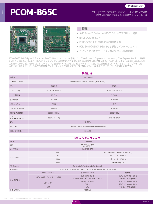 PCOM-B65CはAMD Ryzen™ Embedded 8000シリーズプロセッサを搭載した、COM-Express® Type 6モジュールです。COM Experss Rev 3.1に準拠しています。Zen 4コアに加え、RDNA™ 3グ...
