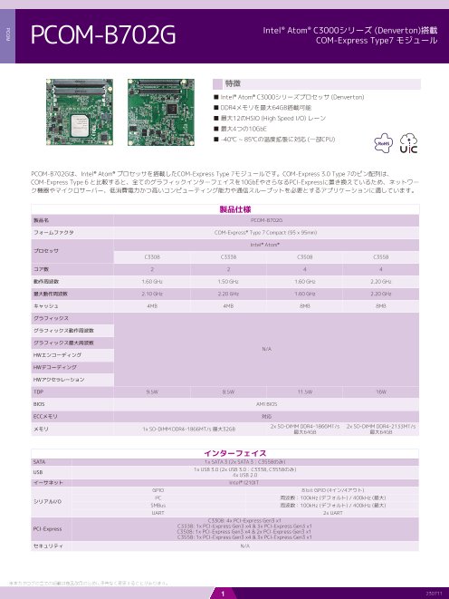 PCOM-B702Gは、Intel® Atom® プロセッサを搭載したCOM-Express Type 7モジュールです。COM-Express 3.0 Type 7のピン配列は、COM-Express Type 6 と比較すると、全てのグラフ...