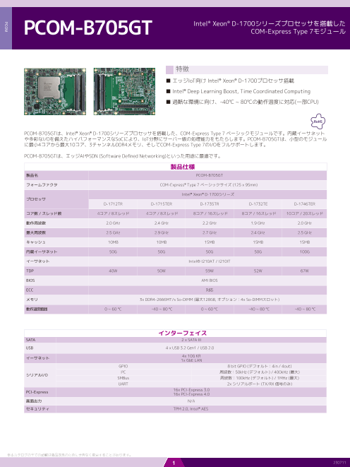PCOM-B705GTは、Intel® Xeon® D-1700シリーズプロセッサを搭載した、COM-Express Type 7 ベーシックモジュールです。内蔵イーサネットや多彩なI/Oを備えたハイパフォーマンス...