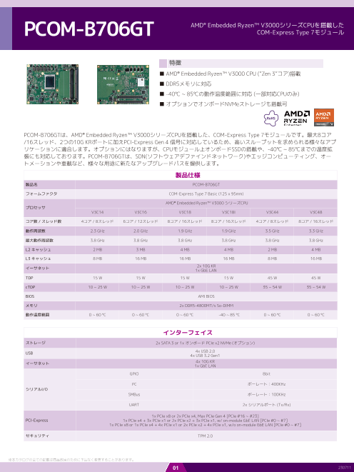PCOM-B706GTは、AMD® Embedded Ryzen™ V3000シリーズCPUを搭載した、COM-Express Type 7モジュールです。最大8コア/16スレッド、2つの10G KRポートに加えPCI-Express Gen 4 信...