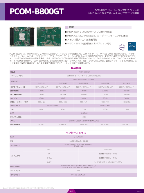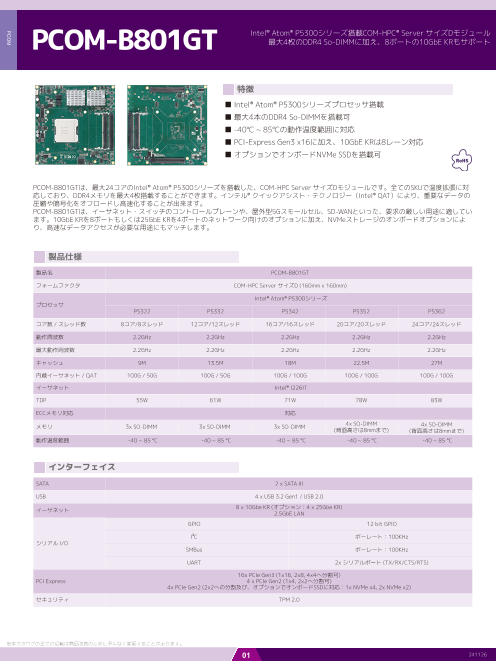 PCOM-B801GTは、最大24コアのIntel® Atom® P5300シリーズを搭載した、COM-HPC Server サイズDモジュールです。全てのSKUで温度拡張に対応しており、DDR4メモリを最大4枚搭載す...