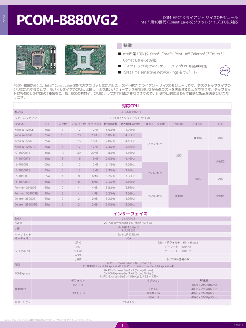PCOM-B880VG2は、Intel® Comet Lake-S世代のプロセッサに対応した、COM-HPC® クライアント サイズCモジュールです。デスクトップタイプのCPUに対応することで、モバイルタイプ...