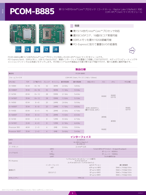 PCOM-B885は第13/14世代のIntel® Core™プロセッサに対応したCOM-HPC® Client サイズCモジュールです。PCI-Express Gen5、DDR5メモリ、USB 3.2 Gen2x2など、高速インターフェイ...