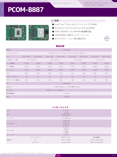 ■ 特徴・Intel® Core™ Ultra 200U/H シリーズプロセッサ搭載・PCIe Gen5 x8, 2x PCIe Gen4 x4, 12x PCIe Gen4 x1対応・2x DDR5 So-DIMMに対応・USB4を含めた多彩なイン...