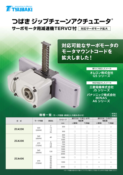 つばきジップチェーンアクチュエータサーボモータ用減速機TERVO付とは?ジップチェーンアクチュエータととサーボモータ用減速機TERVOを一体化することで部品点数を削減。各社の...
