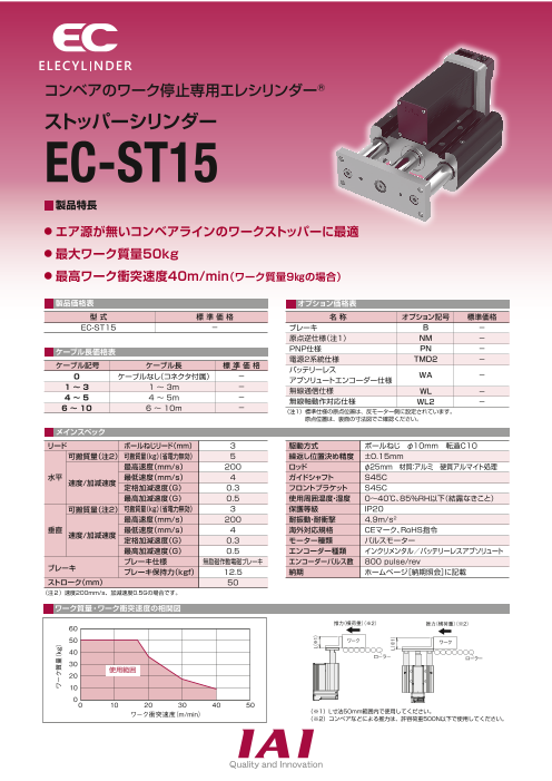 <主な特長>①エアー源がないコンベアーラインのワークストッパーに最適。②最大ワーク質量50kg③最高ワーク衝突速度40m/min(ワーク質量9kgの場合)