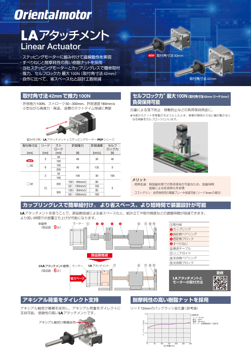 ・LAアタッチメントは、すべりねじと樹脂ナットによる直線動作機構・当社ステッピングモーターとカップリングレスで簡単取付・取付角寸法42mmで推力および、セルフロック力 最大100N・自作に比べて、省スペース化と設計工数削減