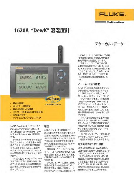 DewK 1620A デジタル温湿度計は、2 つのチャンネルで温度を ±0.125 ℃、湿度を ± 1.5 %で測定し、大型の明るい画面に表示します。イーサネット、ワイヤレス(オプション)、また...