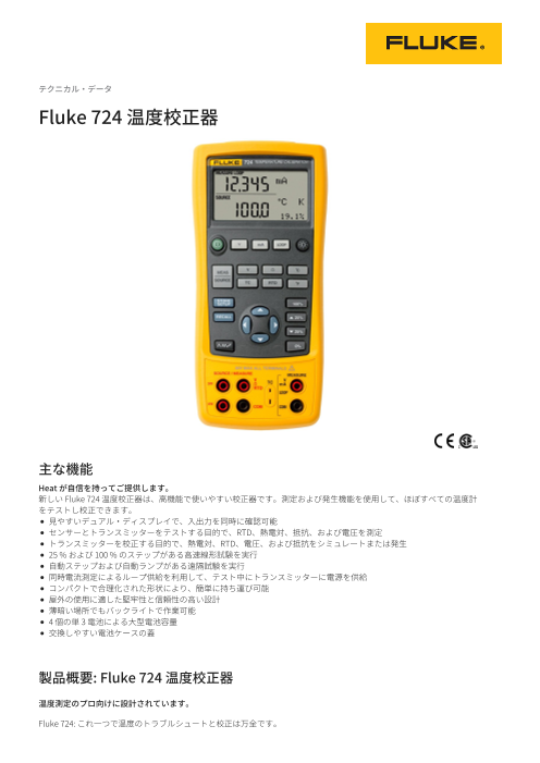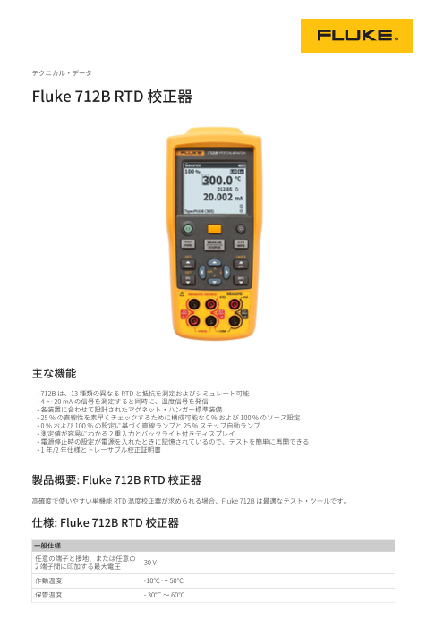 Fluke 712B RTD Calibrator (本器) は多様な RTD を測定お よび供給するバッテリー駆動のハンドヘルド装置です。4 ~ 20 mA 測定のための絶縁されたチャンネルも搭載さ...