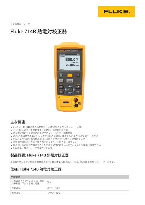 「714B」 は、高確度で使いやすい単機能熱電対温度校正器が求められる場合、Fluke 714B は最適なテスト・ツールです。主な機能・714B は、17 種類の異なる熱電対とmVを測...