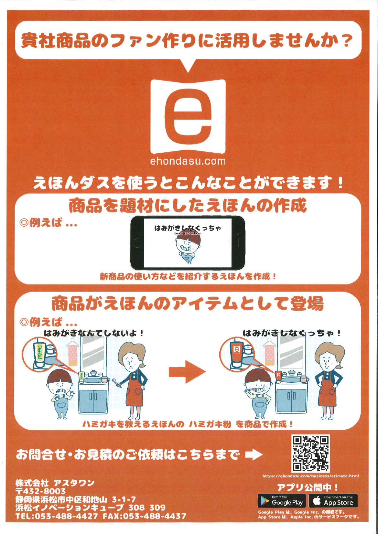 貴社製品のファン作りに活用しませんか?えほんダスを使うとこんなことができます!・商品を題材にしたえほんの作成 例)新商品の使い方などを紹介するえほんを作成!...