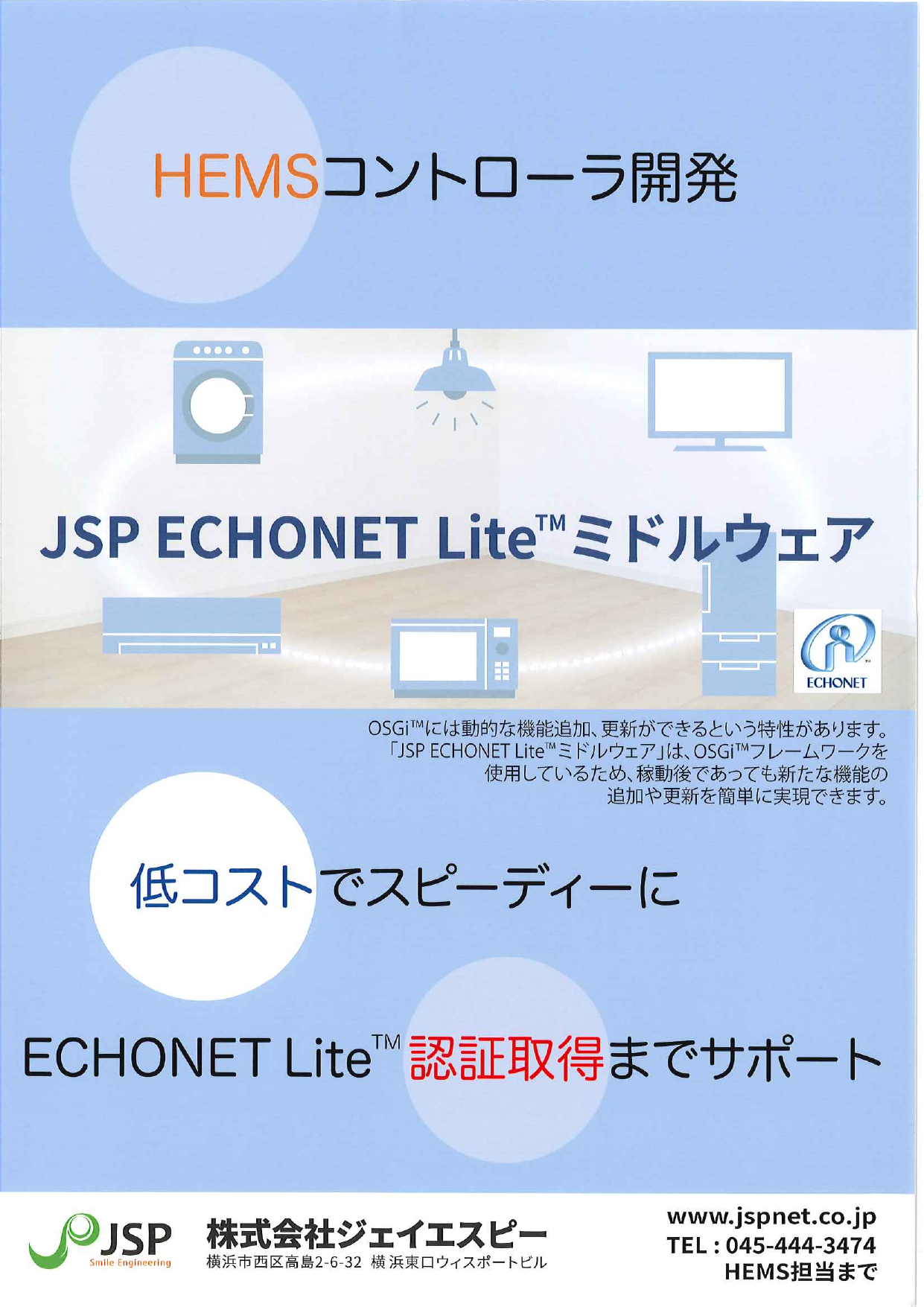 OSGiには動的な機能追加、更新ができるという特性があります。「JSP ECHONET Lite ミドルウェア」は、OSGiフレームワークを使用しているため、稼働後であっても新たな機能の...