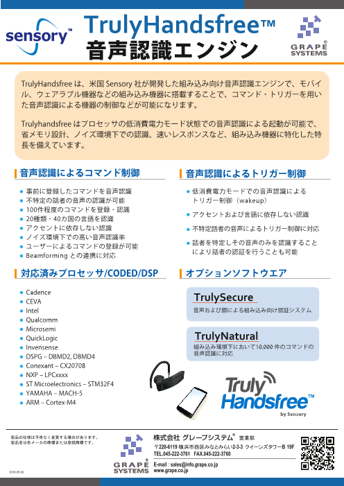 製品情報:https://www.grape.co.jp/speech/sensory.htmlTrulyHandsfree は、米国 Sensory 社が開発した組み込み向け音声認識エンジンで、モバイル、ウェアラブル機器などの組...