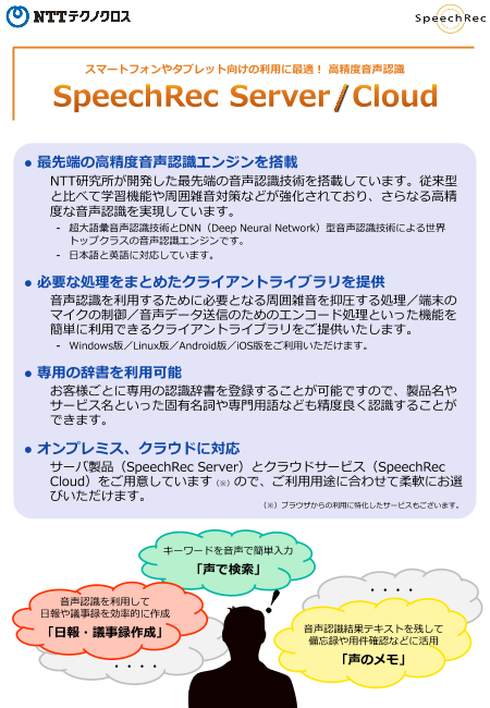 製品情報:https://www.grape.co.jp/speech/speechrec.htmlSpeechRecは、NTTテクノクロスが開発した最先端の音声認識エンジンを搭載した多様な環境下で利用可能な高精度音声認...