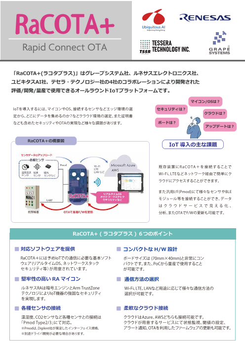 「RaCOTA+(ラコタプラス)」はグレープシステム社、ルネサスエレクトロニクス社、ユビキタスAI社、テセラ・テクノロジー社の4社のコラボレーションにより開発された評価/開発/量...