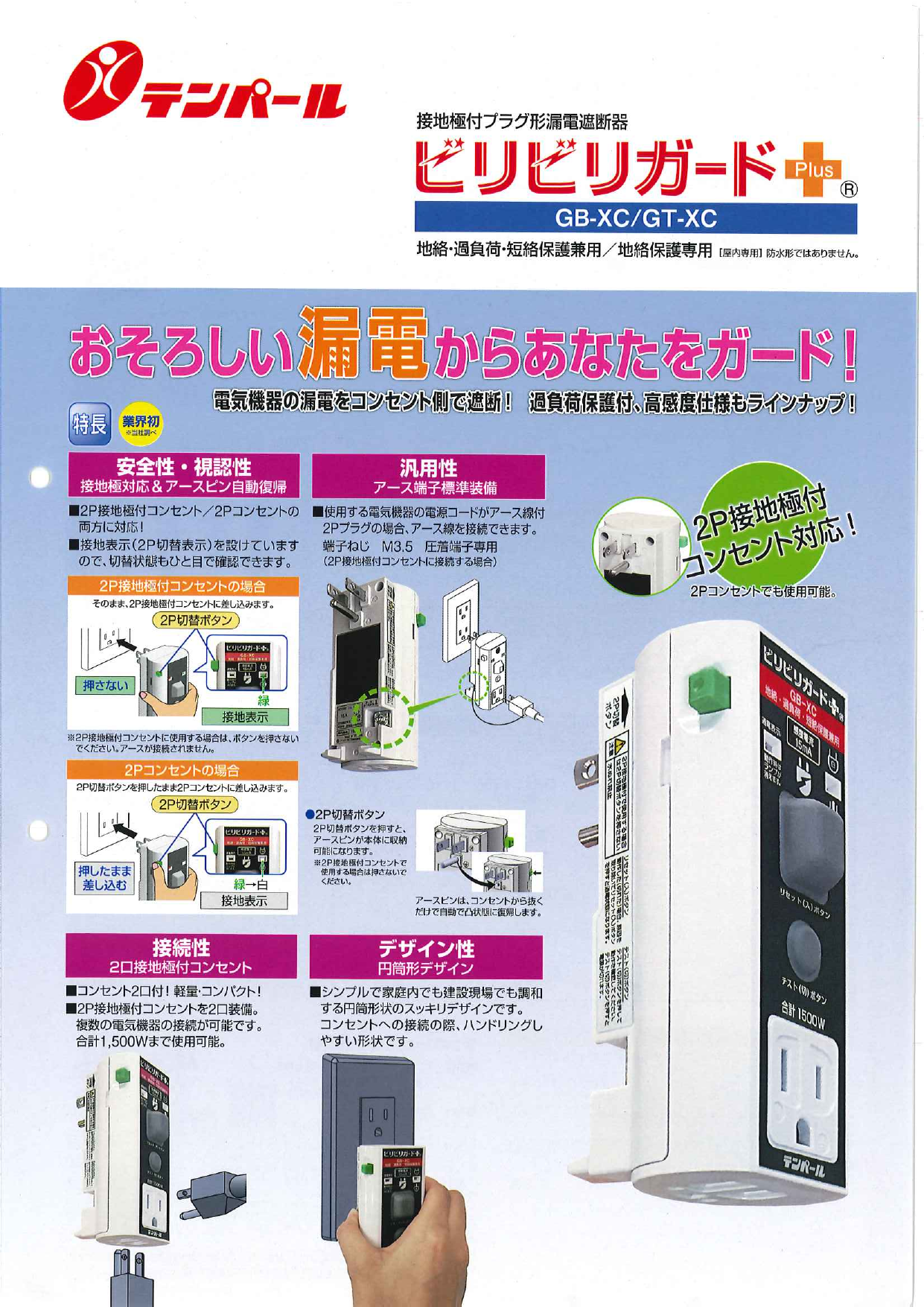 ・電気機器の漏電をコンセント側で遮断!・過負荷保護付、高感度仕様もラインナップ!・2P接地極付コンセント対応!