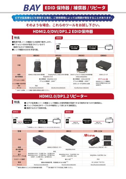 HE021● HDMI 信号の安定・強化 18Gbps(600MHz) 4K UHD 対応DE021● DVI 信号の安定・強化HR021● HDMI 信号の安定・強化 18Gbps(600MHz) 4K UHD 対応DPR-111W● Dis...