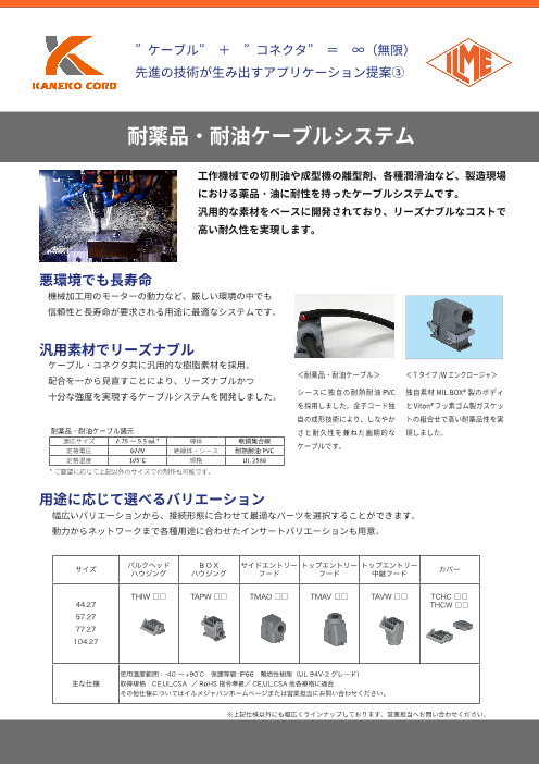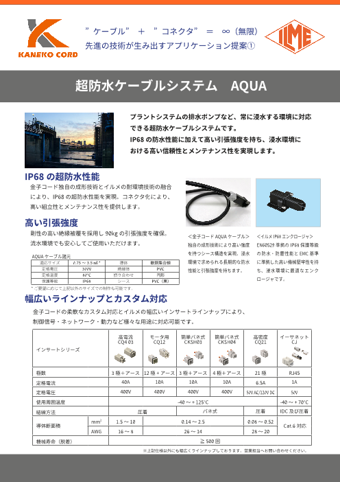 ○IP68の超防水性能○高い引張強度○幅広いラインナップとカスタム対応◆詳細は、カタログをダウンロードしてご覧ください。