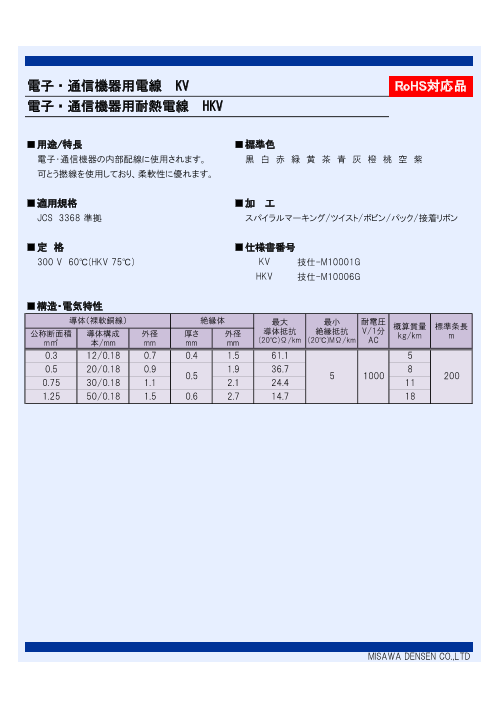 【掲載製品】◆電子・通信機器用電線 KV◆電子・通信機器用耐熱電線 HKV◆単心ビニールコード VSF◆105℃耐熱単心ビニールコード H-HVSF◆電気機器用ビニル絶縁電線 KIV◆...