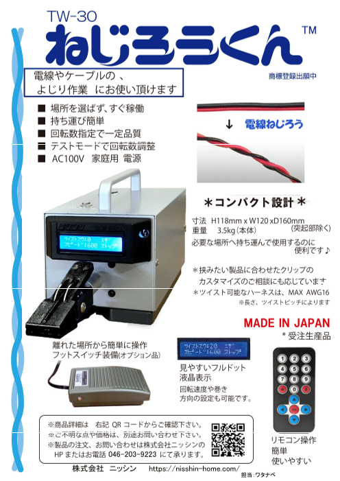 ■場所を選ばす、すぐ稼働■持ち運び簡単■回転数指定で一定品質■テストモードでツイスト数調整■家庭用AC100V電源で使用可能■オプションで挟み力の異なるクリップを使用...