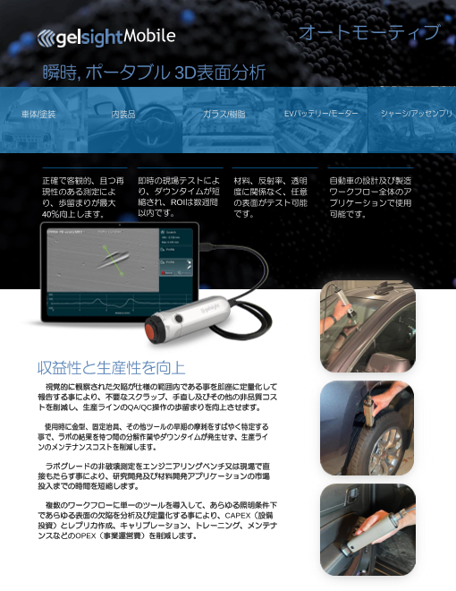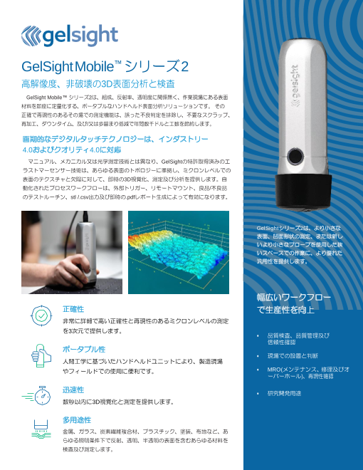 GELSIGHT社(ジェルサイト社)が提供するGelSight Mobile™は、あらゆる表面の3Dトポグラフィを正確に視覚化及び測定するハンドヘルド機器であり、通常の状況では見るのが難しい...