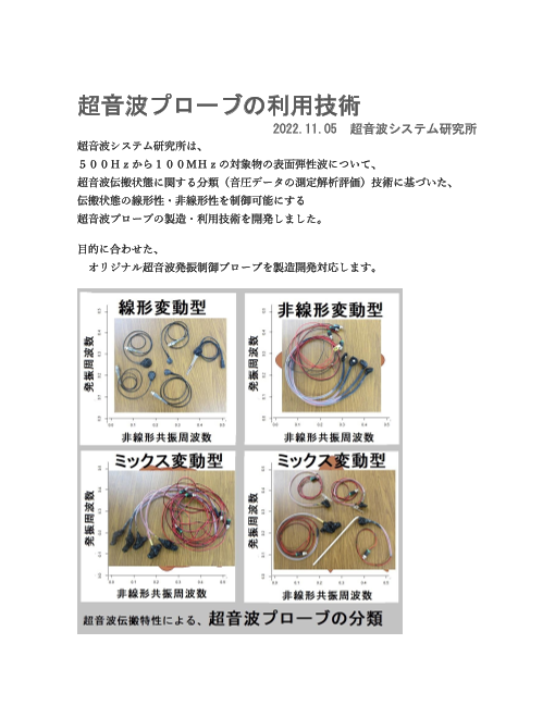 超音波プローブの利用技術 超音波システム研究所は、500Hzから100MHzの対象物の表面弾性波について、超音波伝搬状態に関する分類(音圧データの測定解...