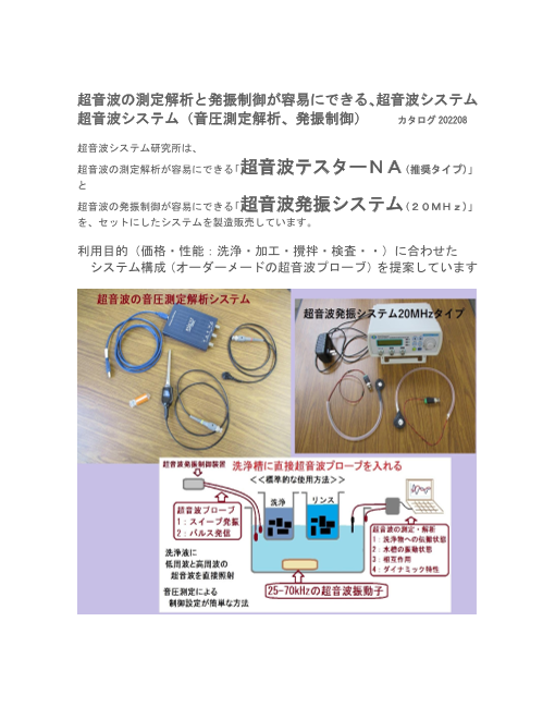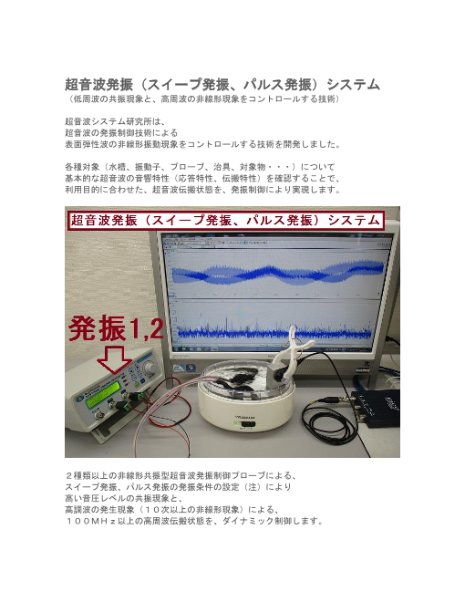 超音波システム研究所は、 *超音波の発振制御技術(オリジナル製品:超音波発振制御プローブ) *超音波伝搬状態の測定技術(オリジナル製品:超音波テスター) *超...
