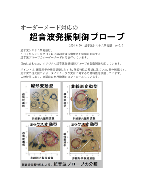 超音波システム研究所は、500Hzから300MHzの超音波伝搬状態を制御可能にする超音波プローブのオーダーメード対応を行っています。目的に合わせた、オリジナ...
