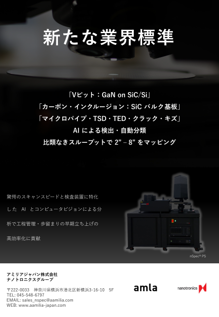 「Vピット:GaNonSiC/Si」 「カーボン・インクルージョン:SiCバルク基板」 「マイクロパイプ・TSD・TED・クラック・キズ」 AIによる検出・自動分類 比類なきスループットで2” –...