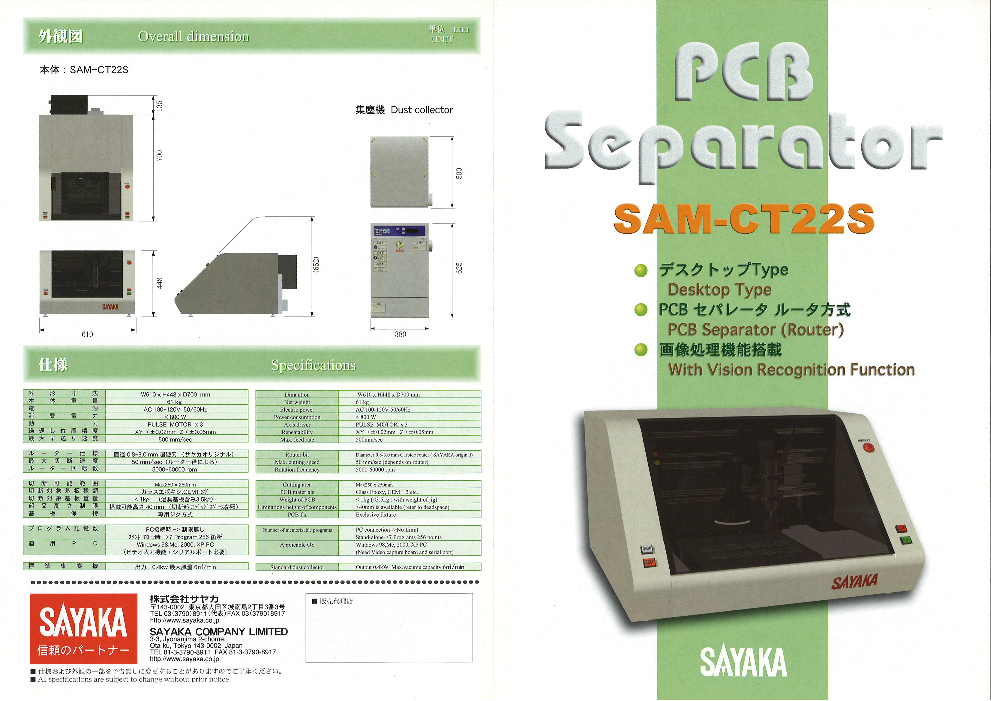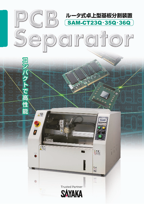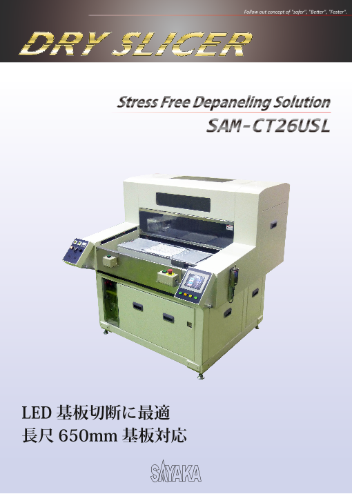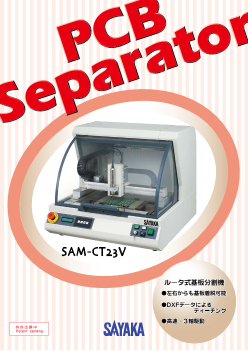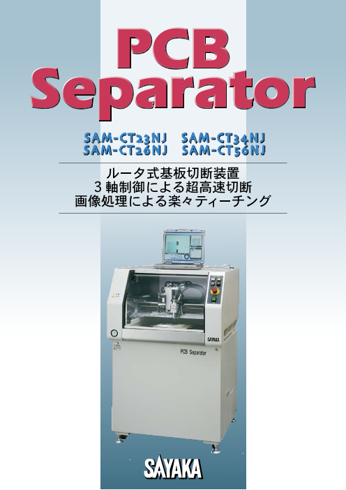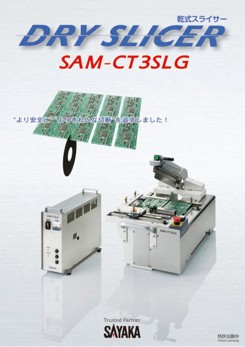 《特長》・切削切断することでより安全に、きれいな切断が可能・手動だった従来機SAM-CT3SLGの基板送りを電動(半自動)化し作業ミスを低減・切断プログラムはタッチパネル上で簡単に作成可能・Vカットなしで基板を分割出来る為、ランニングコストを削減可能...