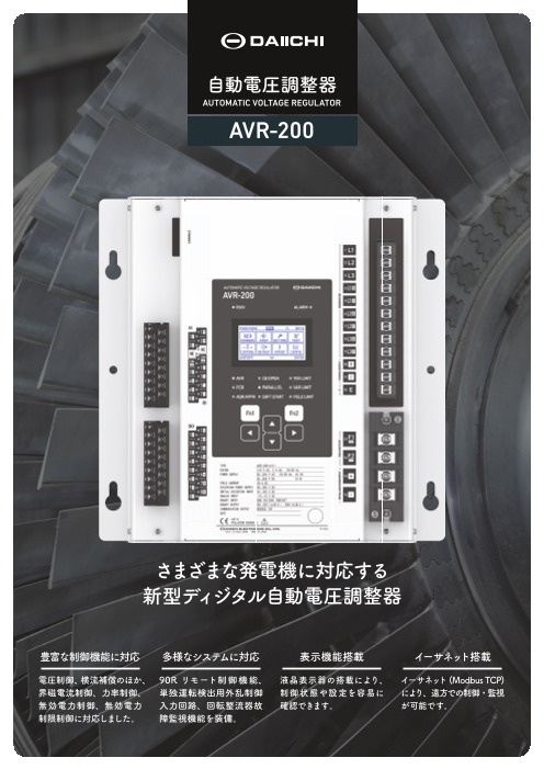 交流発電機の電圧制御に用いられ、界磁巻線の電流を制御して発電機の電圧を一定に制御する制御装置です。発電機とAVR-200を組み合わせることにより、柔軟なシステム構築およびイ...