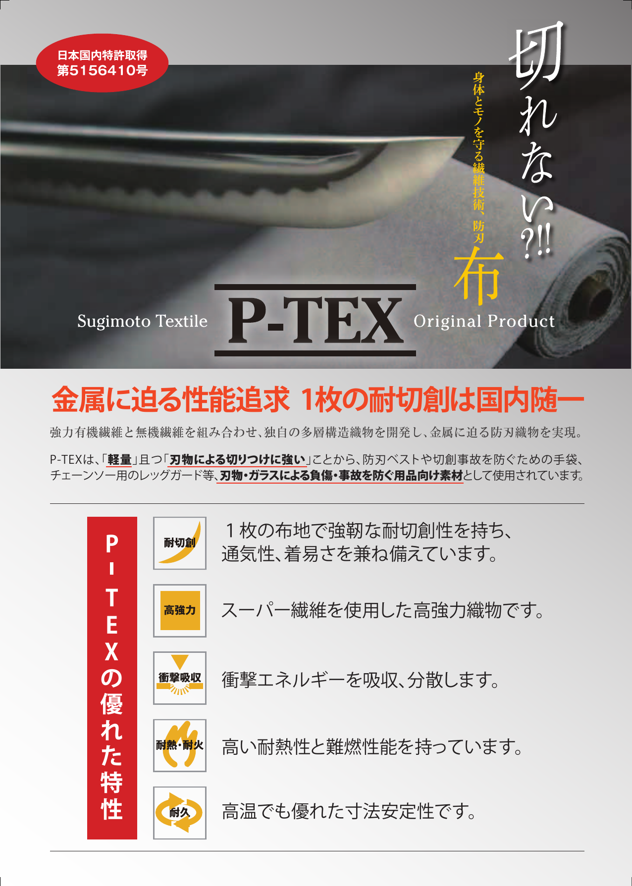 金属に迫る性能追求 1枚の耐切創は国内随一強力有機繊維と無機繊維を組み合わせ、独自の多層構造織物を開発し、金属に迫る防刃織物を実現。P-TEXは、「軽量」且つ「刃...