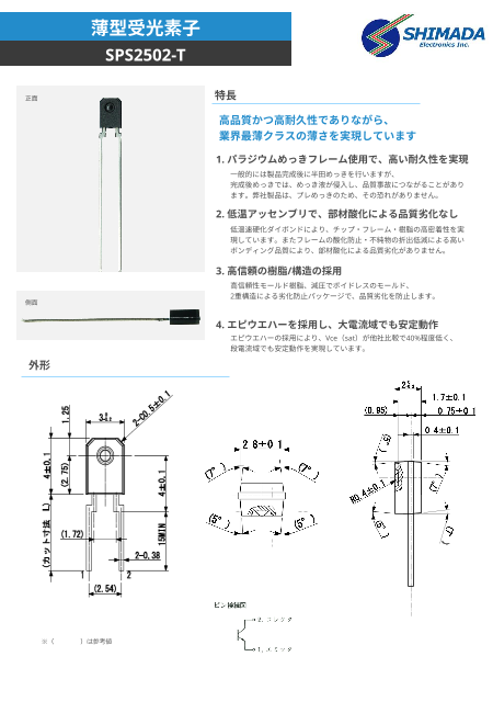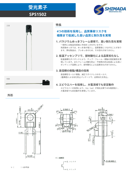 業界最薄クラスの薄型受光素子シリーズです。以下3つの特長を有し、高品質、高耐久で高信頼の製品を実現しています。1. パラジウムめっきフレーム使用で、高い耐久性を実...