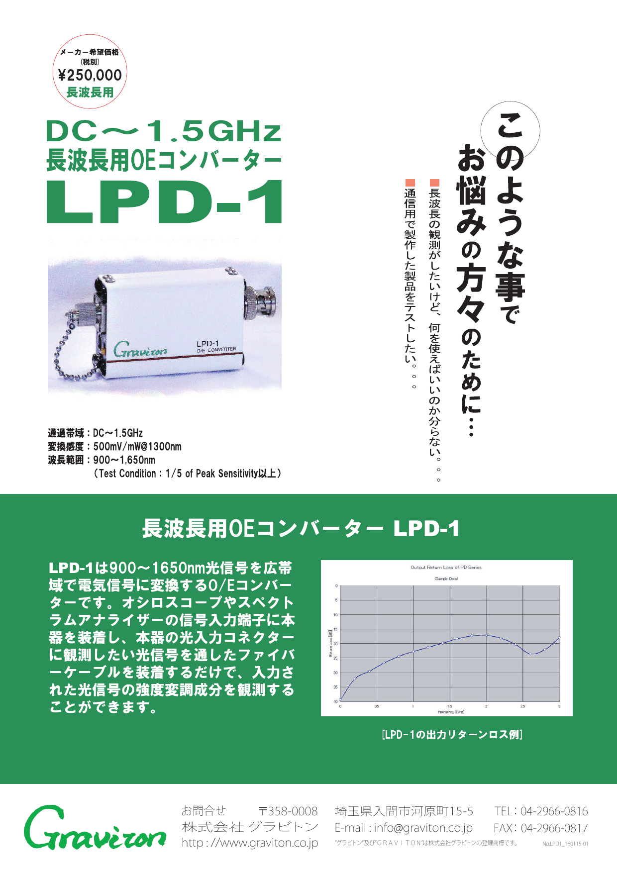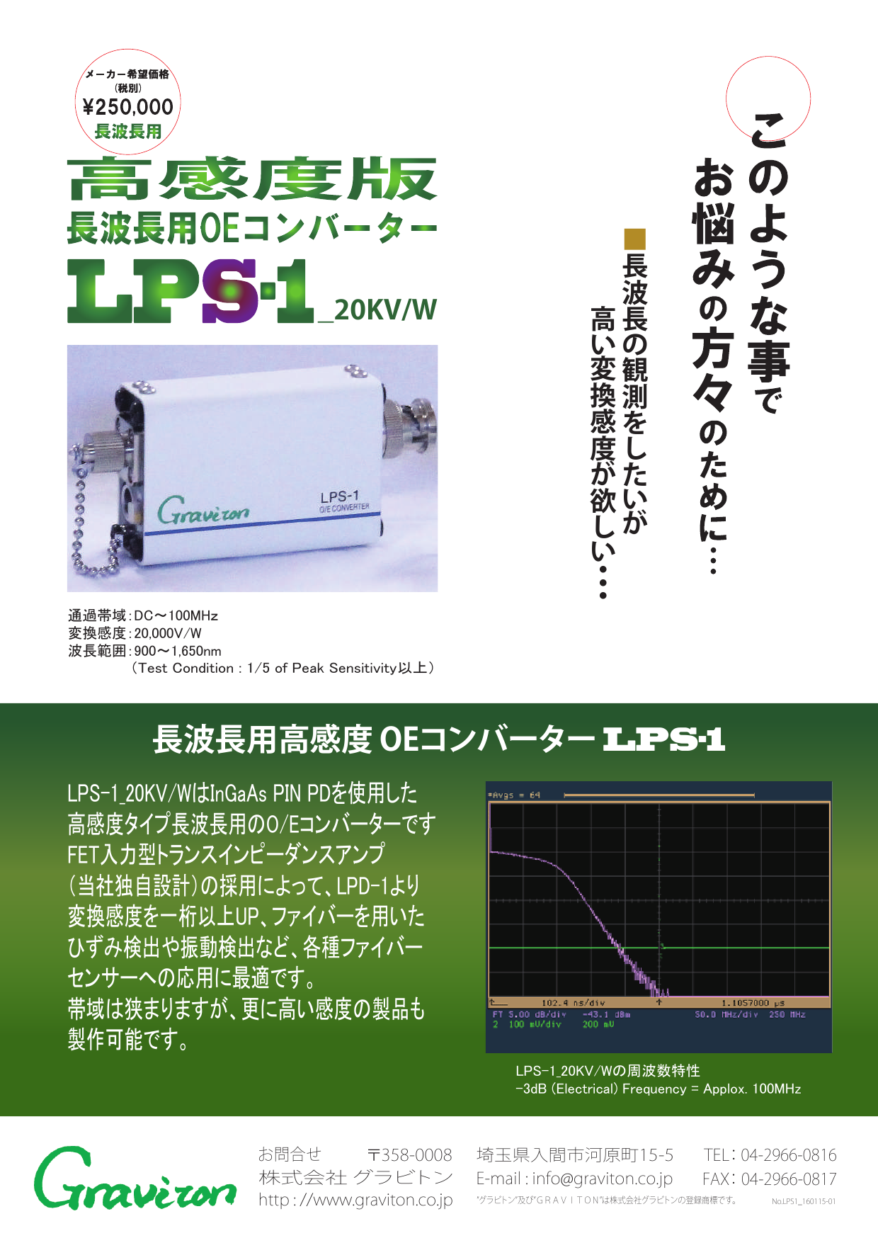 LPSシリーズはGaAsPIN PDを使用した高感度タイプ長波長用のO/Eコンバーターです。FET入力型トランスインピーダンス(当社独自設計)の採用によって、LPD-1より変換感度を1桁...
