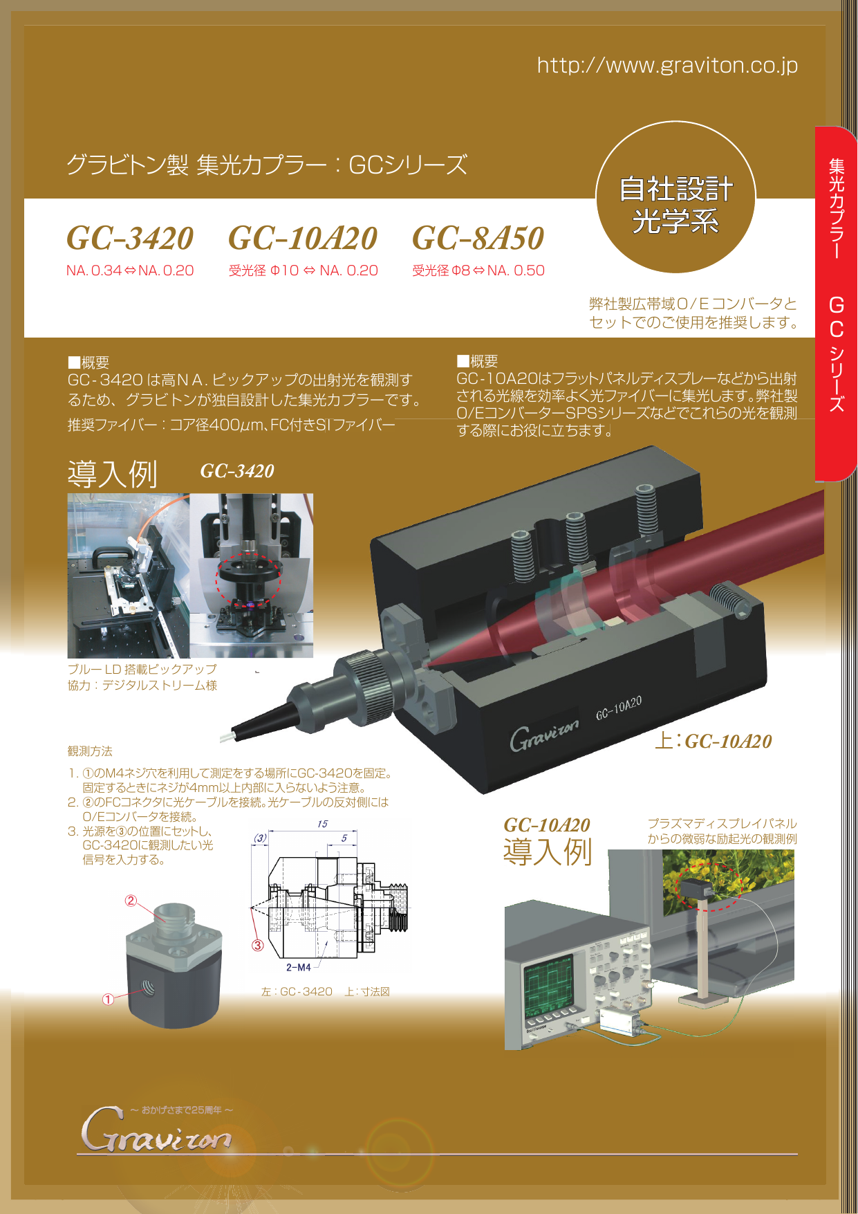 【特徴】○GC-3420 は高NA. ピックアップの出射光を観測するため グラビトンが独自設計した集光カプラーです○GC-10A20はフラットパネルディスプレーなどから出射される...