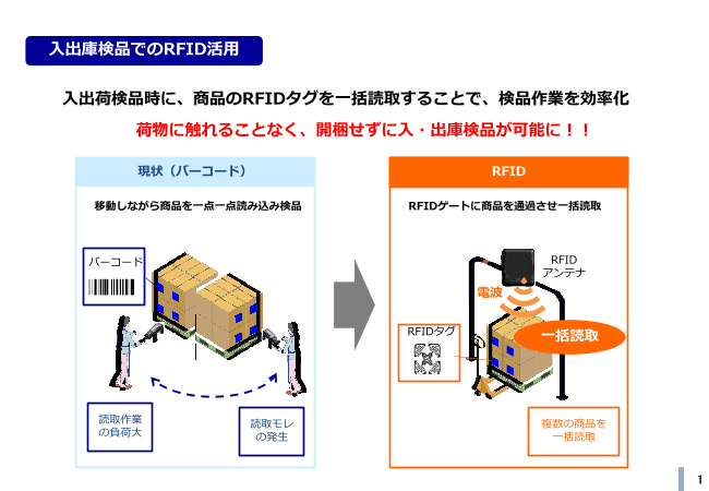 ◆入出庫検品でのRFID活用入出荷検品時に、商品のRFIDタグを一括読取することで、検品作業を効率化◆棚卸でのRFID活用棚卸時に、保管中の商品のRFIDタグを一括読取す...