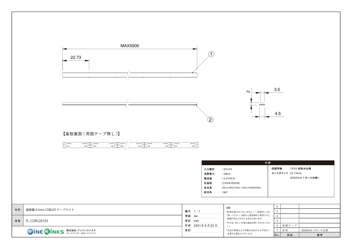 幅4.5mmCOBテープライト「FL-COB528104」仕様書になります。※DC12V