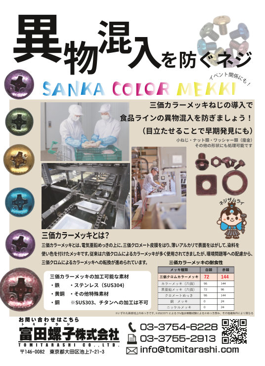 三価カラーメッキねじの導入で 食品ラインの異物混入を防ぎましょう! (目立たせる...