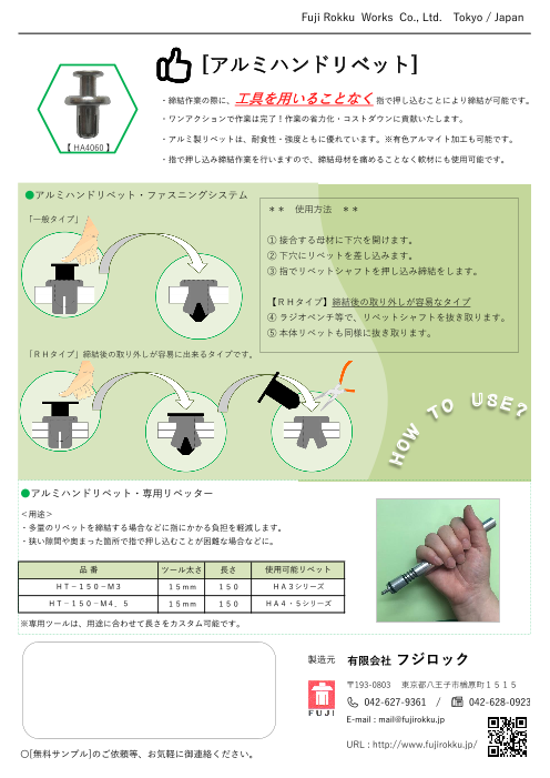創業以来、FUKUI BYORAのファスニング(締結)技術はお客様から頂いた多くのご要望と様々な使用環境によって育てられ、そして磨き上げられて来ました。リベットとリベットセッタ...