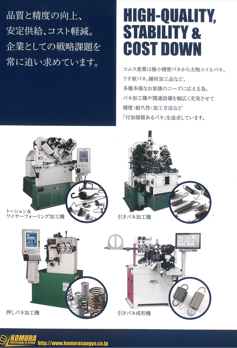 品質と精度の向上、安定供給、コスト軽減。企業としての戦略課題を常に追い求めています。製品紹介◆押しバネ◆引きバネ◆ねじりコイルバネ◆ダブルトーションバネ◆...