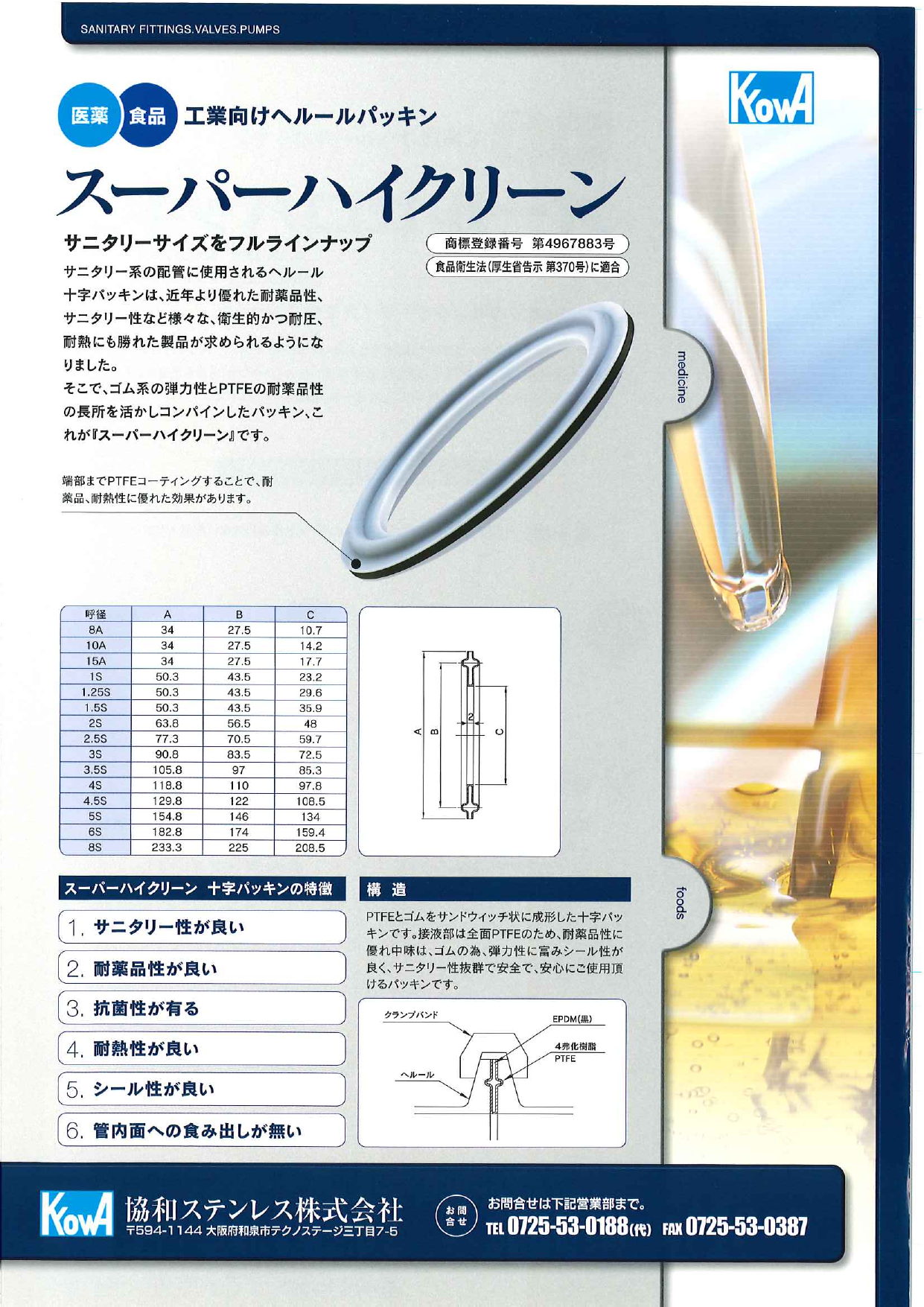 ・スーパーハイクリーン サニタリー系の配管に使用されるヘルール十字パッキンは、近年より 優れた耐薬品性、サニタリー性など様々な、衛生的かつ耐圧、耐熱にも 勝れ...