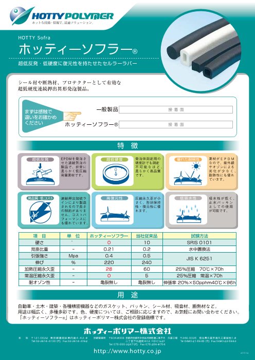 『ホッティーソフラー』は、超低反発・低硬度に復元性を持たせたセルラーラバーです。素材がEPDMなので、紫外線やオゾンによる劣化が少なく、耐熱性にも優れています。連...