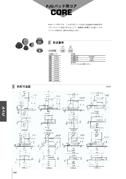 PJGパッド用コアは、じゃばら形パッドPJGにSUS303やPEEK材のアタッチメントを取り付けることで、静電気の帯電やゴム製パッドのワークへの貼付き、跡付きを防止します。◆材質...