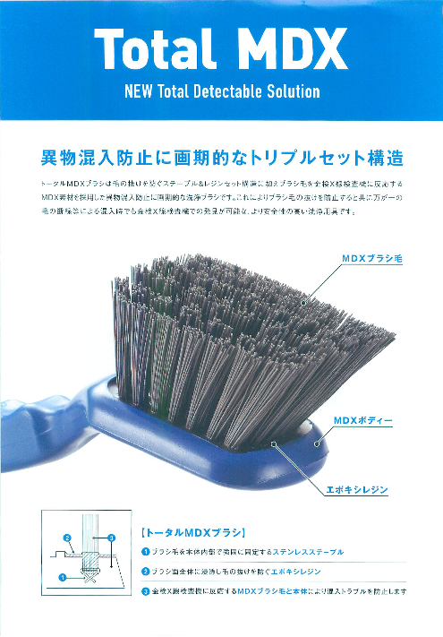 トータルMDXブラシは毛の抜けを防ぐステープル&レンジセット構造に加えブラシ毛を金検X線検査機に反応するMDX素材を採用した 異物混入防止に画期的な洗浄ブラシです。これに...