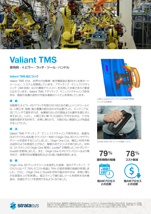 世界中の自動車・航空機製造企業向けに生産オートメーション・システムを開発していValiant TMS 社樹脂や金属の造形が可能な複数のシステムを保有しています。自動車のA ピラ...
