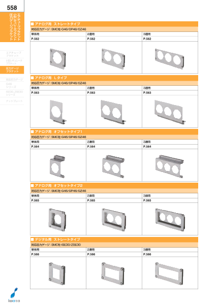 【ラインアップ(抜粋)】■アナログ用 ストレートタイプ ・対応圧力ゲージ:SMC社・G46/GP46/GZ46■アナログ用 Lタイプ ・対応圧力ゲージ:SMC社・G46/GP46/GZ46■アナ...