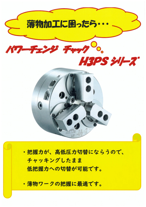薄物加工でお困りなら、パワーチェンジチャックで解決します!一般的なパワーチャックでは対応が難しい低剛性ワークの加工に適し、把握歪みの低減と加工時間の短縮に優れた効果を発揮します。<特長>・増力比、摺動抵抗ともに小さいため、パワーチャックが一般...