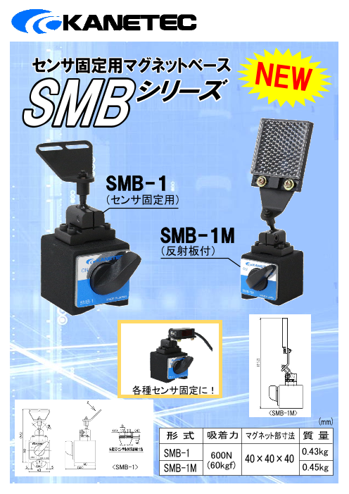 ◆SMB-1(センサ固定用) SMB-1M(反射板付)をラインナップ◆反射板の標準付属で即使用が可能◆ON/OFF切換可能で設置が容易◆三次元ブラケットで位置調整が容易◆強力な吸着...