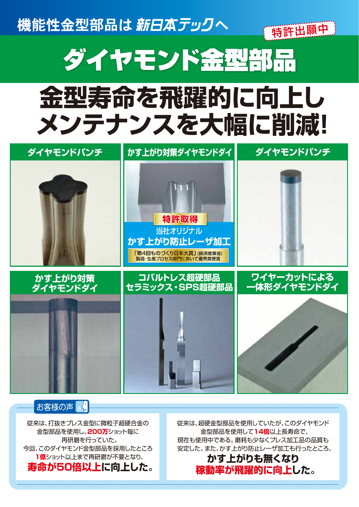 ◆ダイヤモンドパンチ◆かす上がり対策ダイヤモンドダイ◆コバルトレス超硬部品◆セラミックス・SPS超硬部品◆ワイヤーカットによる一体形ダイヤモンドダイ◆詳細は、カタ...